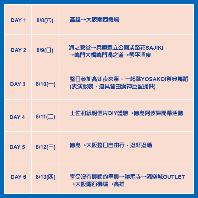 體驗一年一度日本最具代表性的雙大型夏季舞蹈祭典, YOSAKOI(夜來祭)及 德島阿波舞祭,一起體驗活力十足的舞蹈;行程將安排參觀安藤忠雄之經典作品:海之教堂,淡路花SAJIKI賞花海,跟參觀世界三大潮流之一的鳴門渦之道及體驗傳統的「流漿」技法製作土佐和紙明信片~還有滿滿勝運達摩超療癒的勝尾寺!當然少不了逛街採買,除安排臨空城OUTLET,還有幾乎整日的大阪市區購物自由行,享受豐富體驗及購物趣。(詳細行程請參閱報名表)