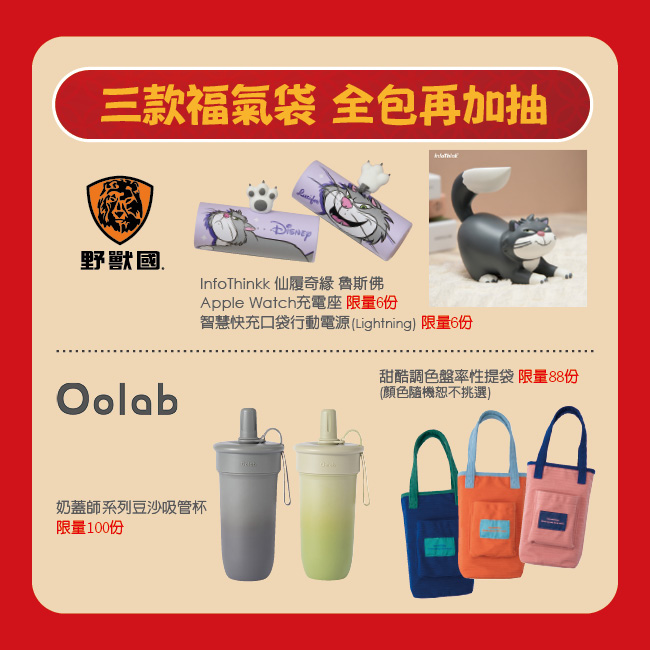 活動辦法:福袋預購期間,當日凡三款福氣袋全購買之顧客,現場可再多抽好禮乙份。獎項為圖中其一,凡抽必有獎,贈品款式恕不得挑選,活動至所有獎項皆抽完為止。