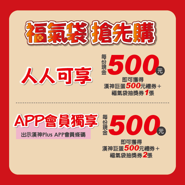 可獲得>>漢神巨蛋禮券500元+福氣袋抽獎券1張