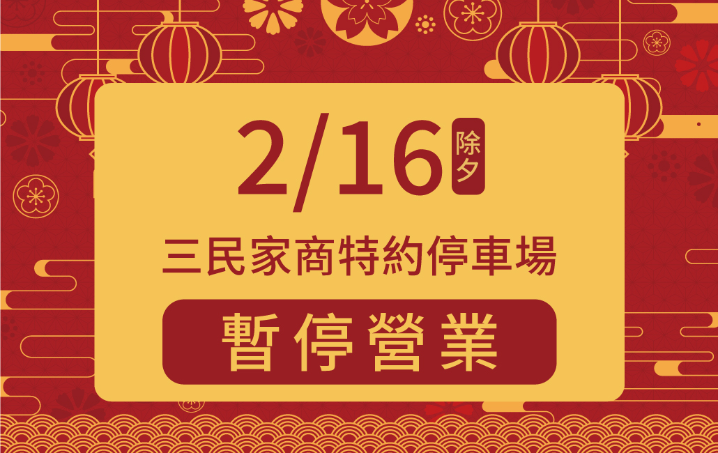 2/16(一)除夕 三民家商特約停車場暫停營業, 造成不便敬請見諒。