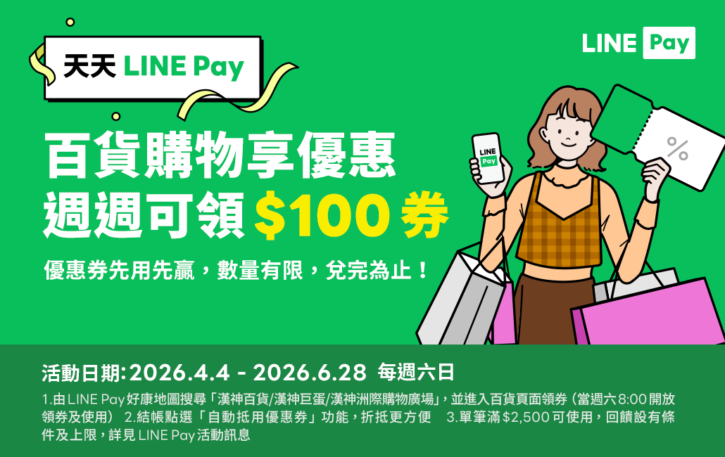 透過LINE Pay好康地圖搜尋「漢神巨蛋購物廣場」領取LINE Pay 100元優惠券,每週六、日使用LINE Pay付款單筆滿2,500元即可折抵100元。