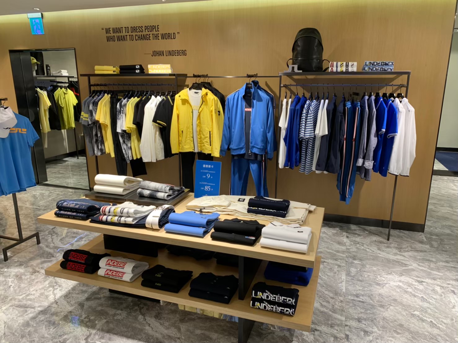 全新J.Lindeberg概念店裝傳達了簡約與強調功能性的現代美學,運用不同建材和清新的色彩基調打造全新店裝,大理石紋地磚帶出北歐大地的沉著優雅、木紋牆面體現北歐森林的知性與溫暖,湛藍色沙發和門簾象徵北歐天空的靜謐深邃;運動區灰色水泥藝術漆則營造出不羈、充滿活力的氛圍。
