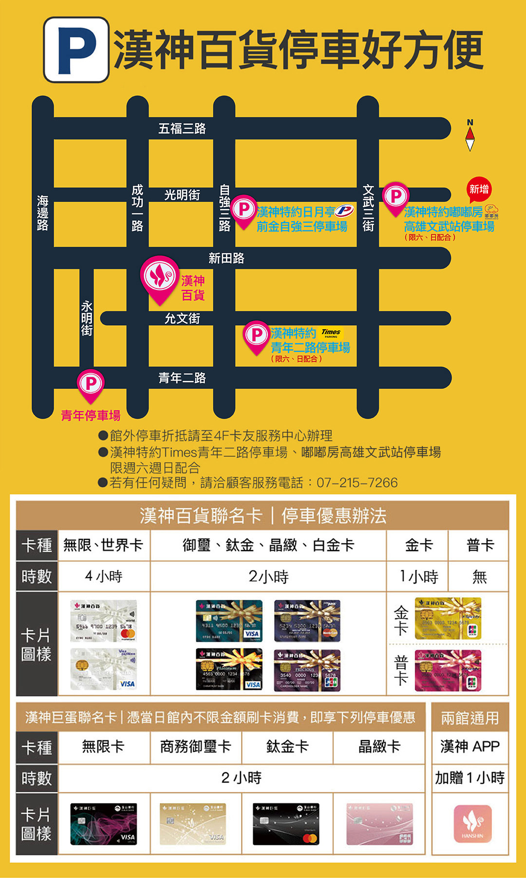 ※若先「使用實體聯名卡過卡」時,系統會自動提供您名下當館聯名卡最高優惠時數,且不再接受第二張聯名卡優惠,亦無法再使用APP條碼折抵1小時,如需增補APP 1小時優惠,請至4F卡友服務中心辦理。 5.漢神特約Times青年二路停車場/嘟嘟房高雄文武停車場(限六、日配合,須憑百貨消費發票) /漢神特約日月亭自強三路停車場請至4F卡友服務中心依實際停車時數兌換停車優惠。 6.以上停車優惠合併每日最高6小時。